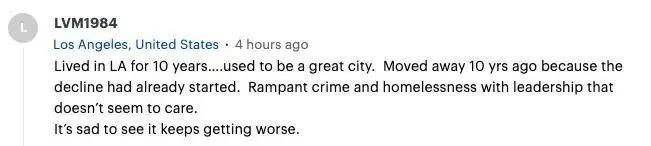 曾在洛杉矶住过十年,它曾是个很好的城市。十年前搬离了那里,因为当时衰退已经开始了。猖獗的犯罪和无家可归者,但政府却似乎并不在意。看着它情况恶化很令人难过。