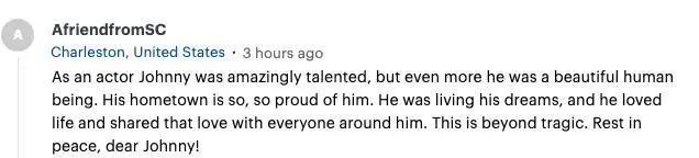 作为一名演员,约翰尼是如此才华横溢,但更重要的是,他是一个很好的人。他的家乡也以他为骄傲。他正在实现他的梦想,他热爱生活,并愿意与他周围的人分享爱。这绝对是一场悲剧,约翰尼安息吧。