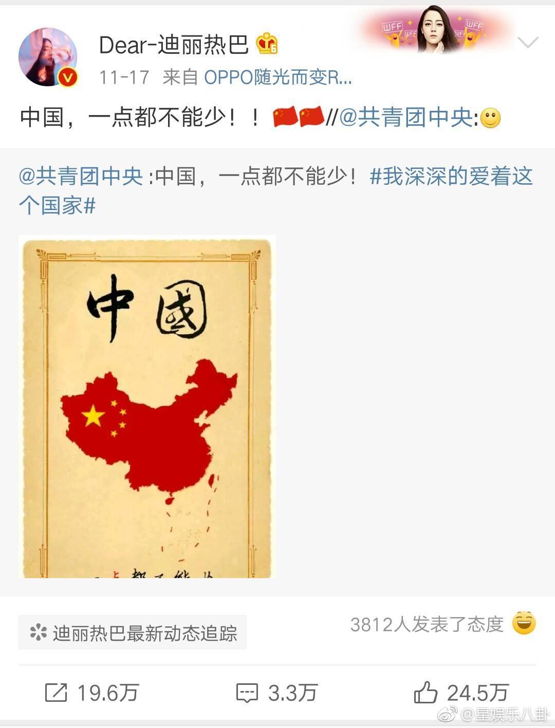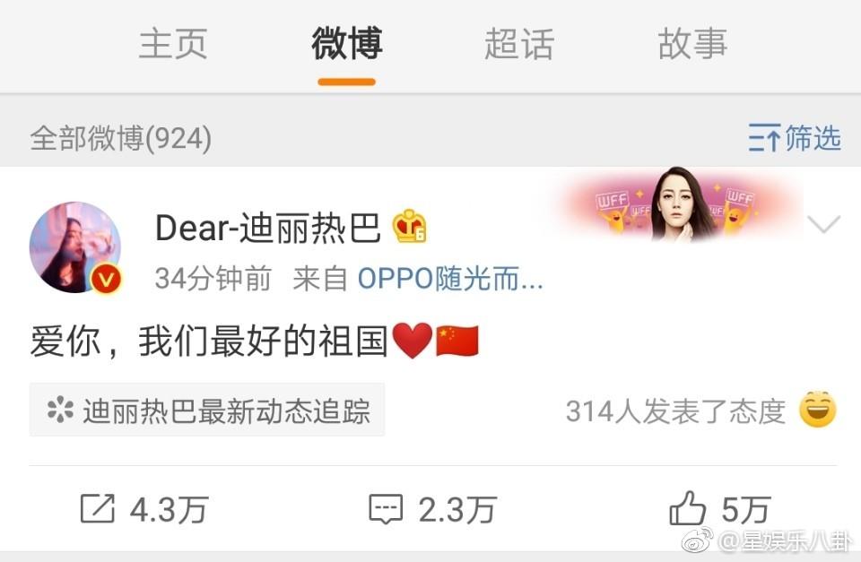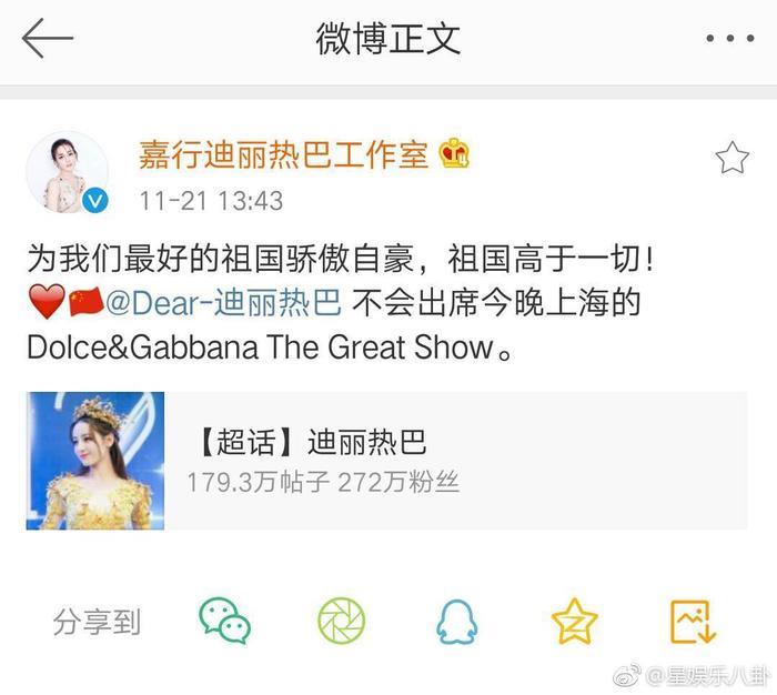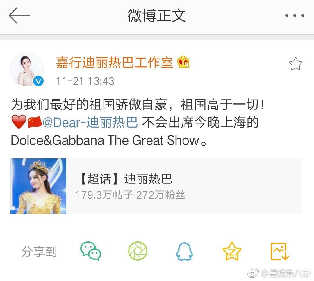 dg设计师兼品牌创始人Stefano Gabbana辱华风波后迪丽热巴更新微博:爱你,我们最好的祖国!迪丽热巴工作室更博:为我们最好的祖国骄傲自豪,祖国高于一切!❤️??迪丽热巴 不会出席今晚上海的Dolce&Gabbana The Great Show!底线不容挑衅,国家利益高于一切,为热巴点赞!@Dear-迪丽热巴