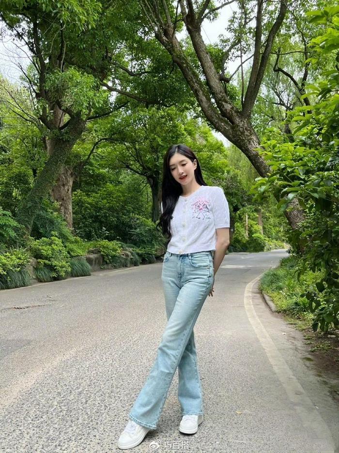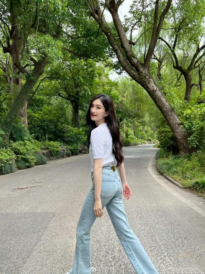 为什么说江疏影不常选择男友风穿搭呢?其实就是因为,她平时给人的形象就是这种清冷知性的美人形象,纯白色修身T恤搭配水洗蓝高腰拖地裤是她日常标配。