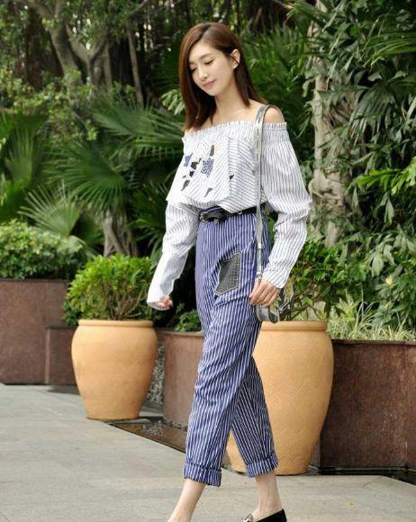 平时江疏影一些休闲风的衣服来也非常的漂亮,这张照片中江疏影穿的这件上衣非常的有特色,抹胸的设计给人一种特别清纯的感觉,下半身穿的这条裤子条纹的设计可以更好的拉长腿部线条,脚上穿了一双非常漂亮的小皮鞋。