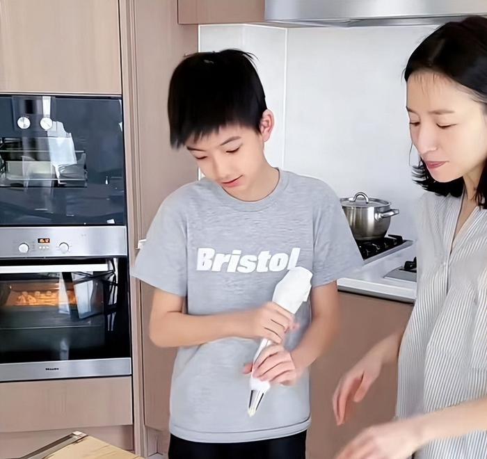 近日,董洁在家中做饼干,13岁儿子突然入镜,网友感叹:老潘(潘粤明)哪,你儿子越来越像你年轻时的模样了。
