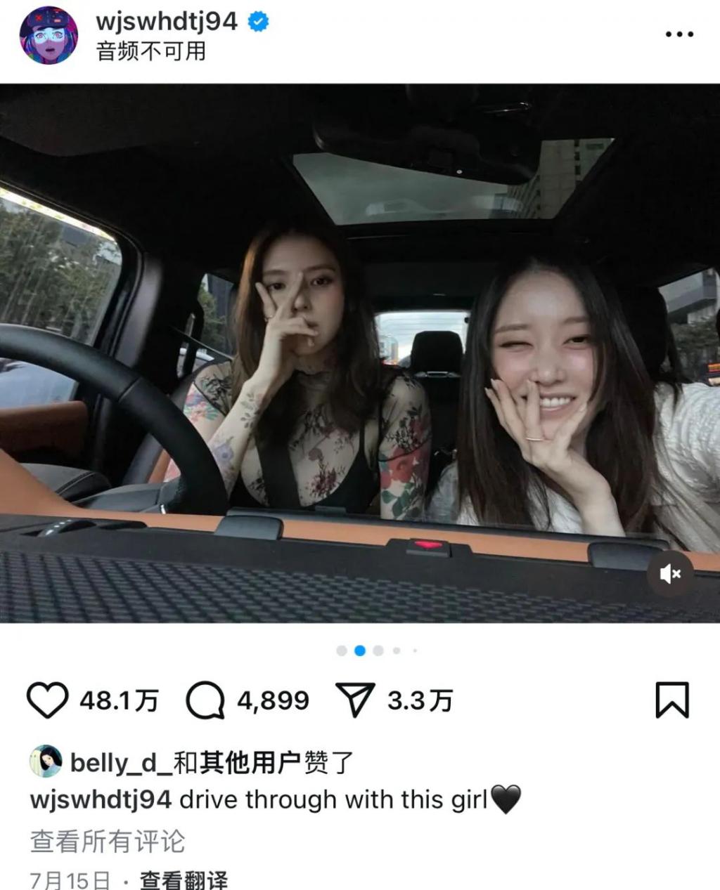 7 月 15 日,全钟瑞个人 ins 更新与韩素希一起外出的认证照。