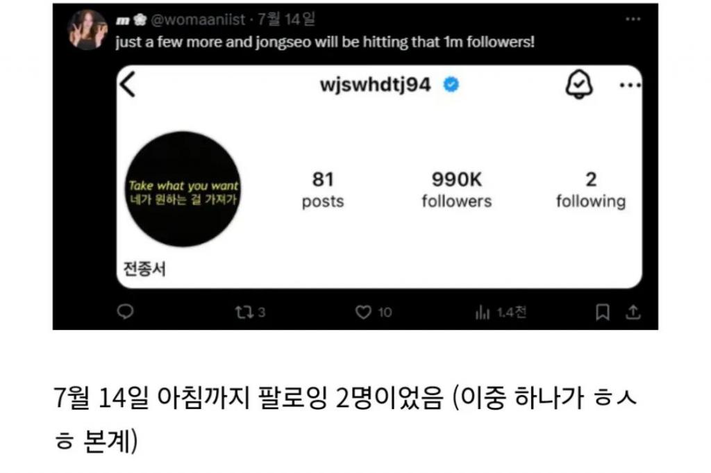 从网友整理的时间线中可以看出,截止到 7 月 14 日早晨,全钟瑞的关注人数还只是 2 名,而其中一人则是韩素希本人。