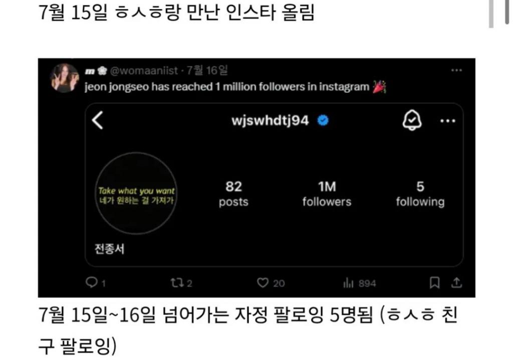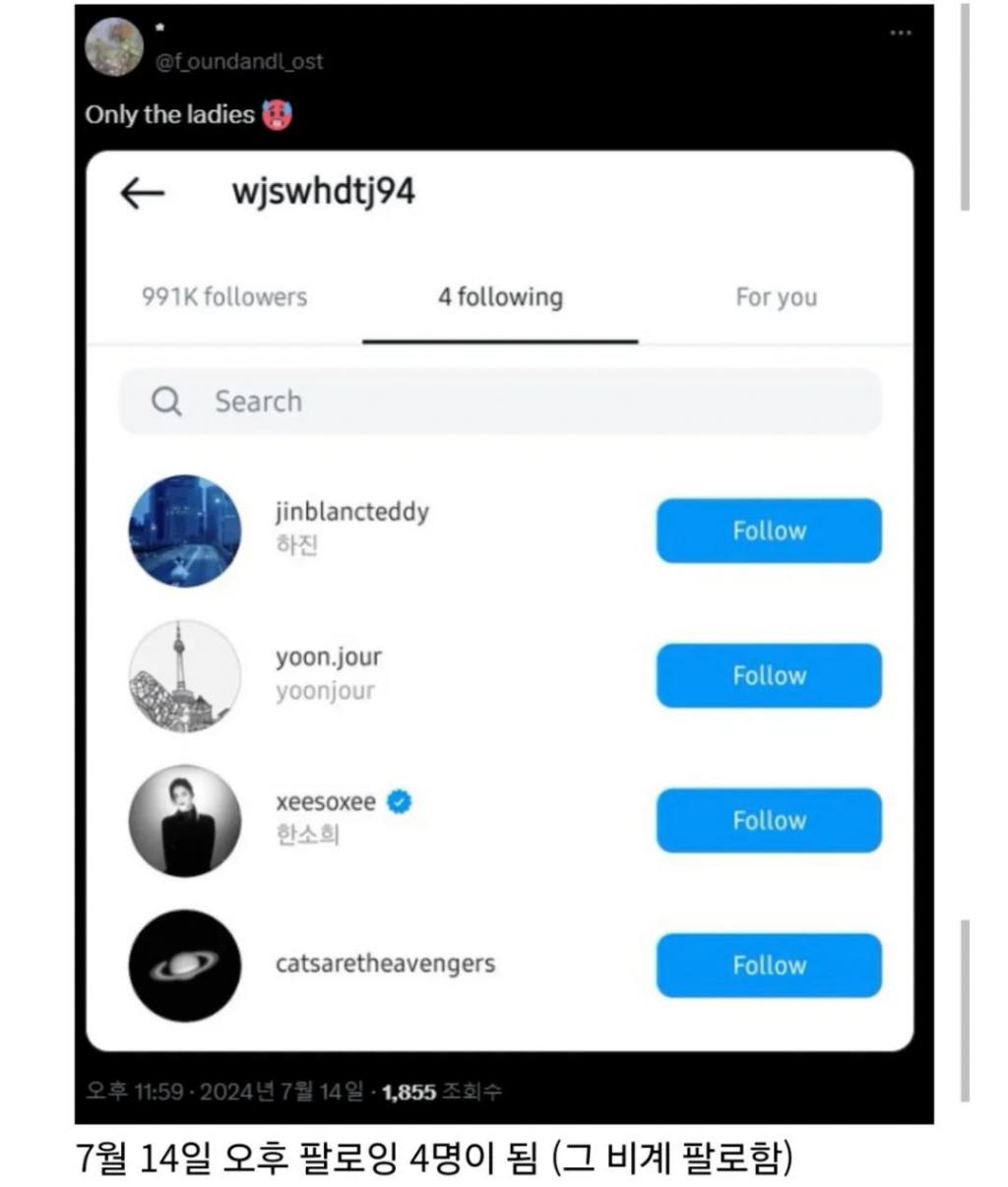 7 月 16 日,全钟瑞的关注人数增加至 5 人,新增的一人为韩素希的好友。