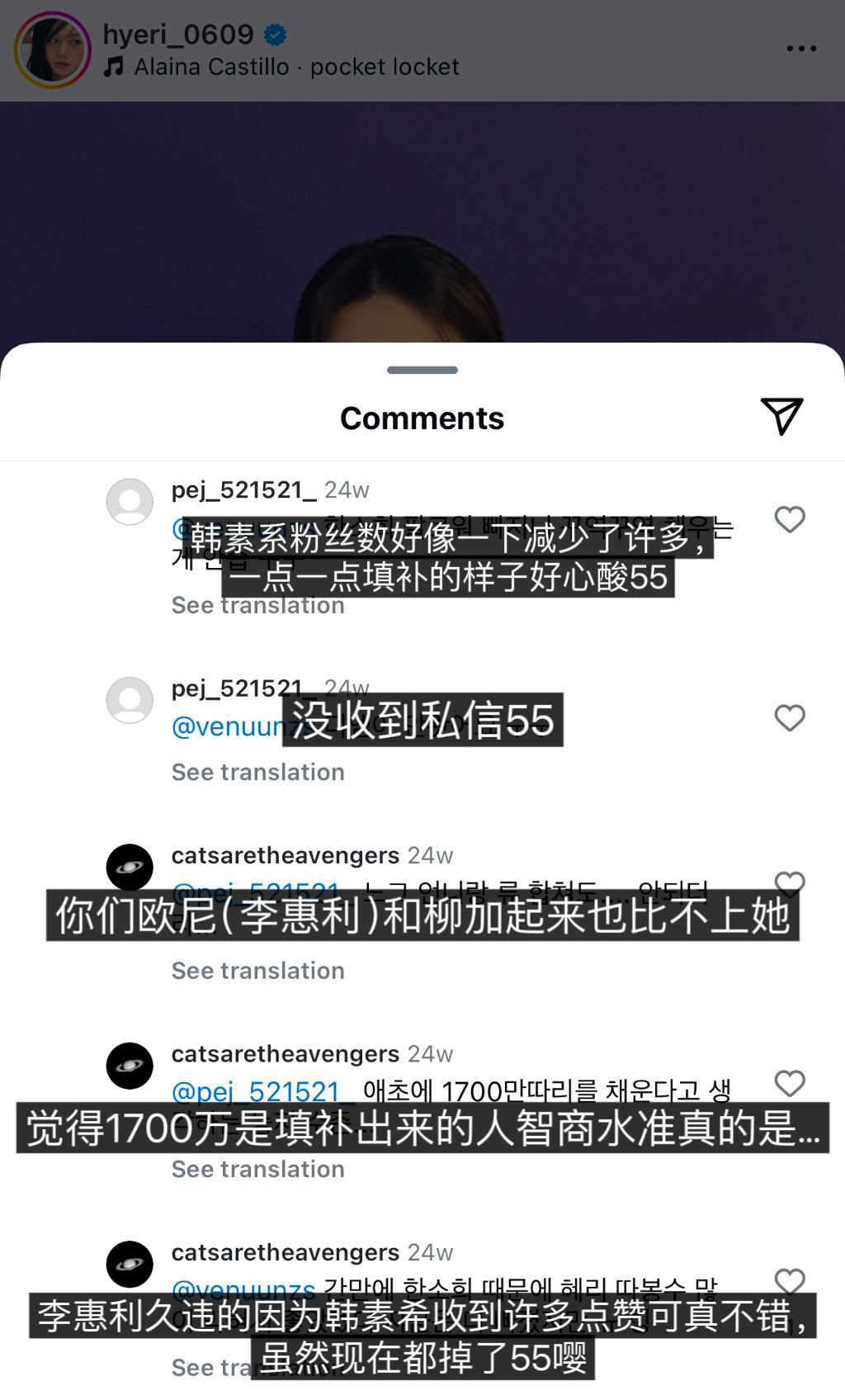 据悉,帖子中提及到的这个 "cataretheavengers" 为非公开账号,自今年 3 月创建以来便不断的在李惠利的 SNS 下留恶评,甚至以此来达到提及韩素希的目的,而 3 月恰好是韩素希与柳俊烈的恋情曝光时期。