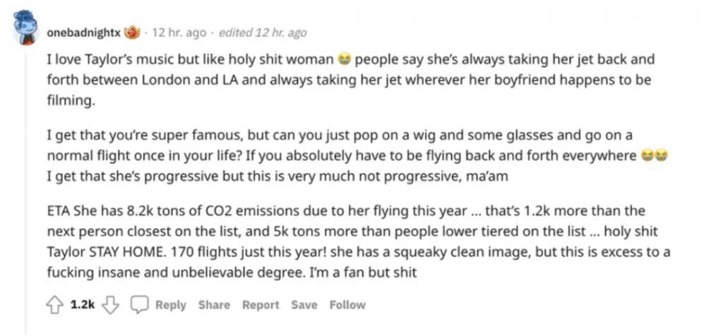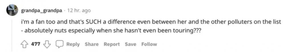 她今年的二氧化碳排放量是 8200 吨……比第二名多 1200 吨,比名单上排名靠后的人多 5000 吨……天哪,霉霉请待在家里吧。霉霉今年飞了 170 次 !她平时确实干净利落,但这已经超出了疯狂和令人难以置信的程度。我是个粉丝,但并不认可这种行为。