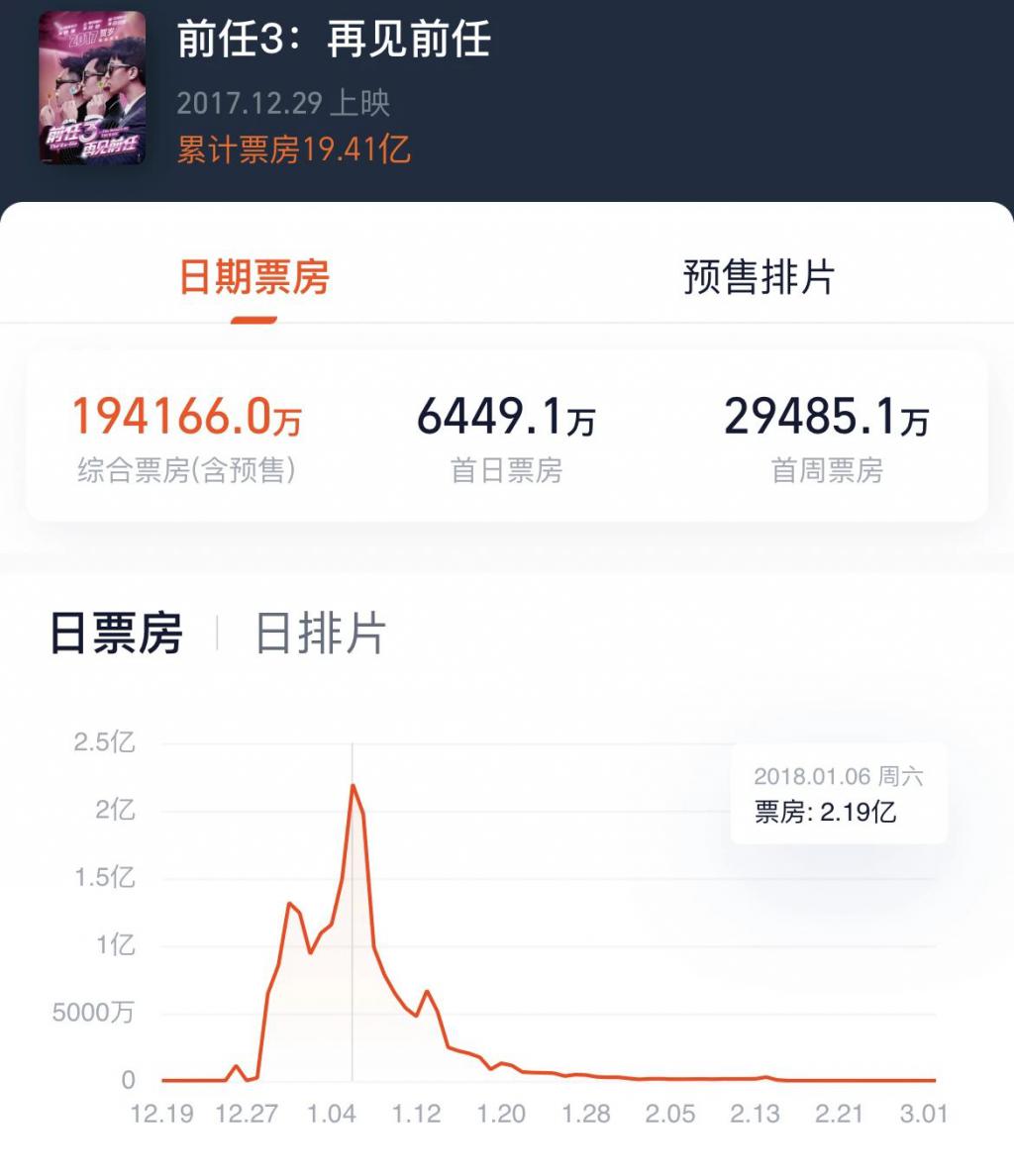 就是这种情绪引起了大众强烈共鸣,带动票房持续走高。在贺岁档,《前任 3》以 1.6% 的排片开局,经过 3 次票房逆跌,票房一路高涨,单日票房最高达 2.03 亿,连续多日票房占比超 50%,同档期《妖猫传》《解忧杂货店》根本无力抗争,《前任 3》的凶猛势头一直持续到 2018 年情人节档,最终拿下 19.4 亿票房。