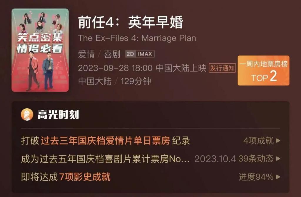 六年后,《前任 4》来了,一如《前任 3》" 气势汹汹 "。上映当天,《前任 4》拿下票房、观影人次、上座率、预售四项日冠,成为单日电影大满贯得主,甚至豆瓣开分 6.8,超过了同档期张艺谋导演的《坚如磐石》,也高于前三部的评分。