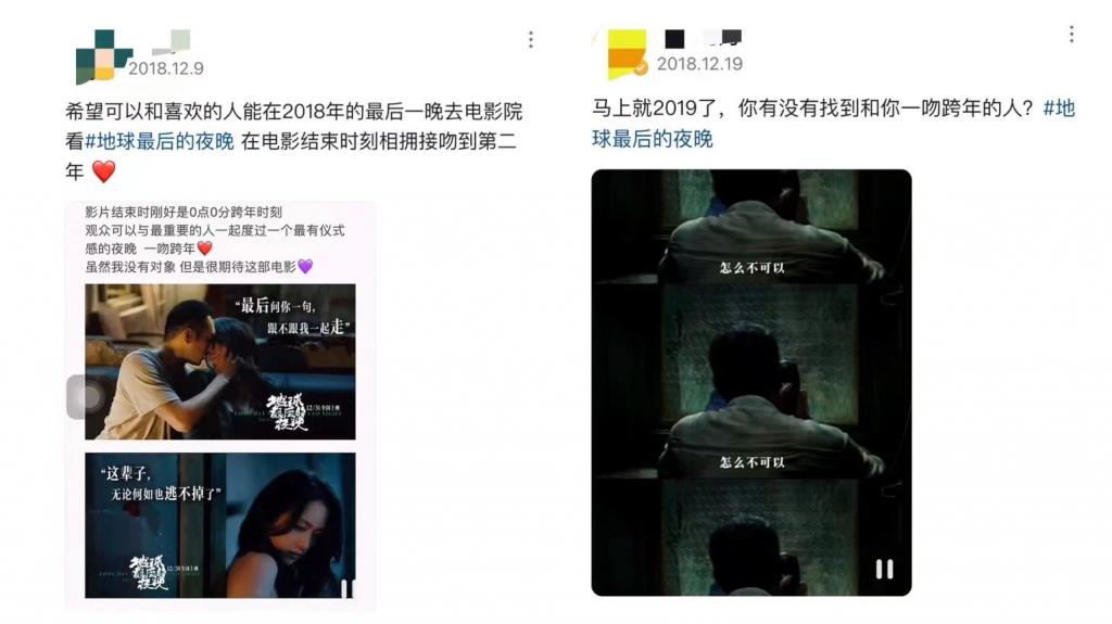 之后 2018 年《地球上最后的夜晚》再次证明了短视频的潜力,一条 "2018 年最后一晚去电影院和喜欢人一起看《地球最后的夜晚》" 的备忘录在抖音突然火起来,宣发团队在抖音平台开展 " 一吻跨年 " 营销活动,大量用户被营销的观影仪式感带动,纷纷购票,电影上映首日票房就破 2 亿,票房占比达到了 50.8%,这对于一部文艺片来说,堪称奇迹。