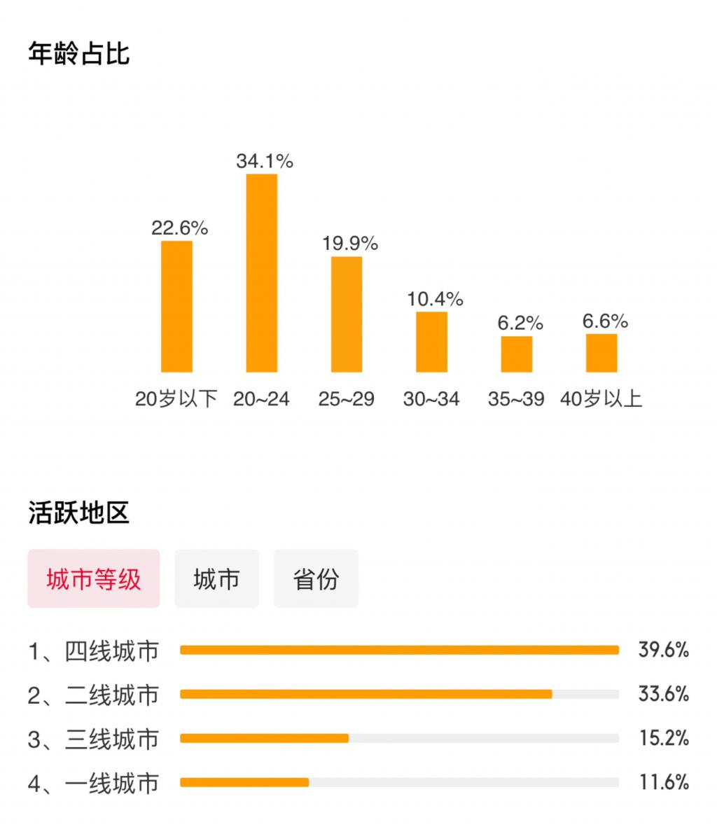 根据猫眼专业版数据,《前任 3》的用户画像显示,四线城市占比最高,达到了 39.6%。年龄占比中,20-24 岁的年轻人最高,达 34.1%。