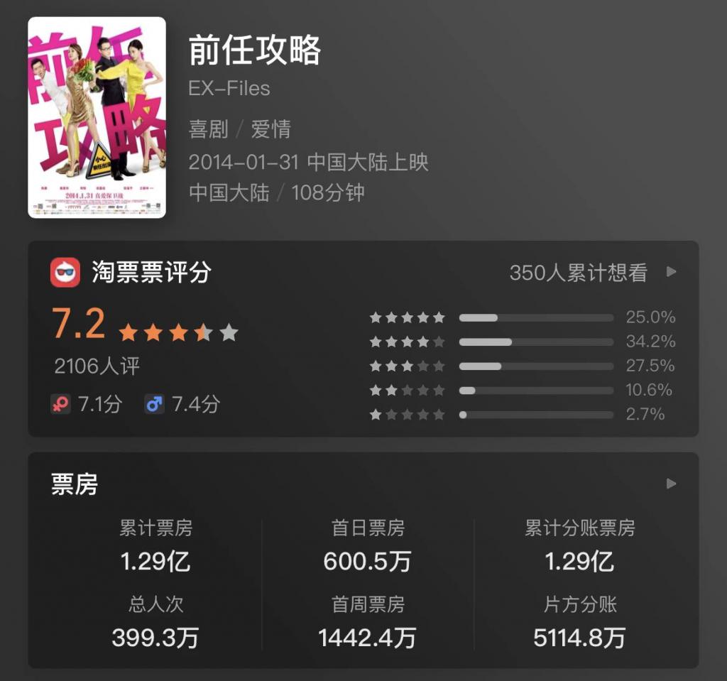 当时电影还没做完,制片人就决定定档春节,虽然排片率只有 5%,但靠着长线口碑,《前任攻略》拿下 1.29 亿的票房。