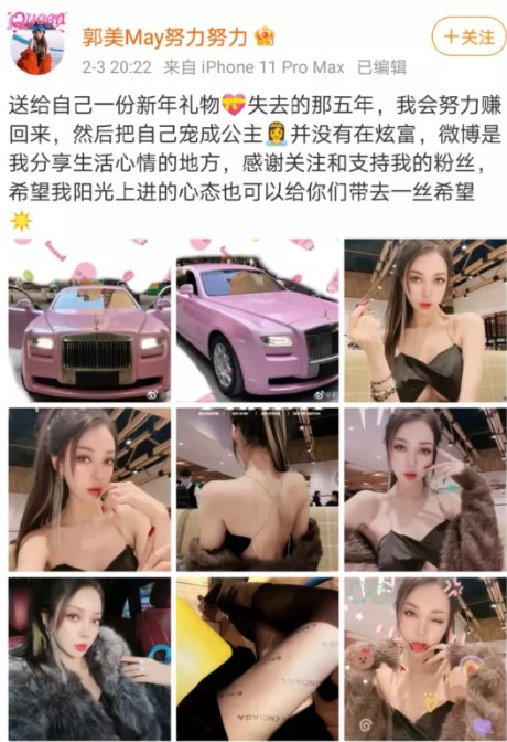 现在网红及娱乐圈流行的豪门人设,早就是郭姐当年玩剩下的招数了。那会儿,刚20岁的郭美美,20岁生日礼物就是一辆玛莎拉蒂,满满一柜子的爱马仕、香奈儿,更别提名牌手表等物了,简直是奢靡无度的生活。
