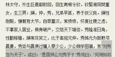 其中「縯常非笑之,比于高祖兄仲」,縯即是刘秀兄弟刘縯,高祖兄仲即是指汉高祖刘邦的哥哥就仲。刘邦即位后封刘仲为代王,后匈奴来攻,本是农民的刘仲直接吓得逃走了,为天下笑。刘縯在这里用刘仲来形容刘秀,可见他哥哥并不看好刘秀,还常常嘲笑他,认为他只是会「性勤稼穑」,就干农活很勤快。