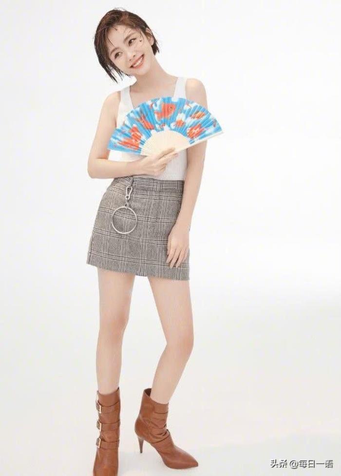 谭松韵棕色短发随意披散在脸上,面带甜美笑容,上身穿白色背心,很实穿且基础设计感的单品,手拿蓝色扇子,下身穿灰色高腰短裙,大秀性感锁骨和身材,搭配脚上棕色高跟鞋,提升整个人的气质,能轻松驾驭穿高挑好身材,十分可爱!