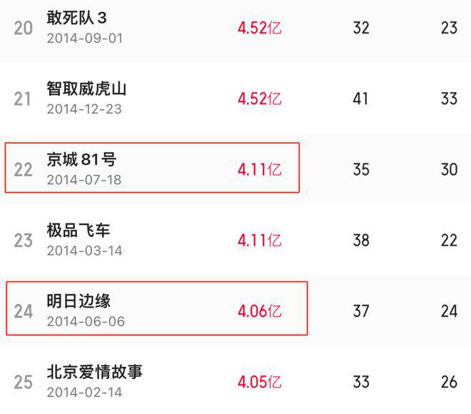 但,就是这个现在看来一无是处的片子,在当年竟然打败了阿汤哥的《明日边缘》,拿到了4.11 亿的票房。