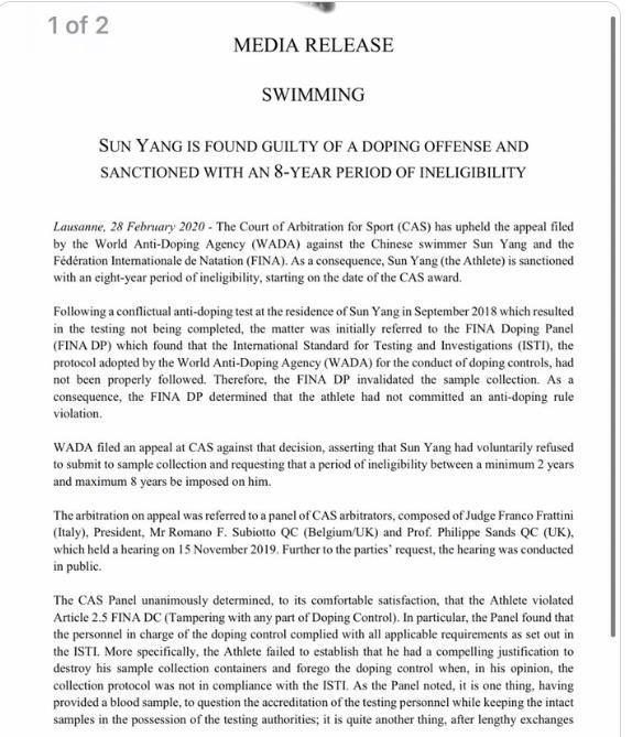 2月28日,国际体育仲裁法庭(CAS)的秘书长总部向媒体发表简短声明,并亲自宣布孙杨涉”暴力抗检”案听证会的裁决结果,裁决书中正式裁定世界反兴奋剂机构(WADA)胜诉,孙杨被禁赛八年,即日起正式生效,但此前孙杨取得的比赛成绩依然有效。