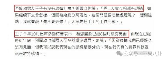可长时间不见面对恋人来说太痛苦了,邓丽欣当时坦言有想过该如何和王子继续下去这段感情,甚至结婚的问题他们也有想过,但强调大家都要先把手头的工作做好。