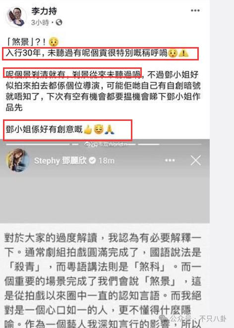 她的说法很快被李力持导演给怼了,称自己入行 30 年从来没听说过还有 " 煞景 " 这个词,讽刺邓丽欣 " 邓小姐好有创意 "。