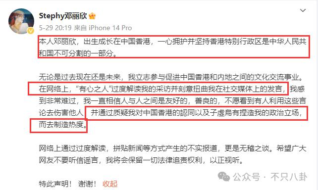 今年 5 月 29 号,邓丽欣发微博再澄清说自己不是 gd,网络上," 有心之人 " 过度解读她的采访,扭曲她在社媒上的发言。