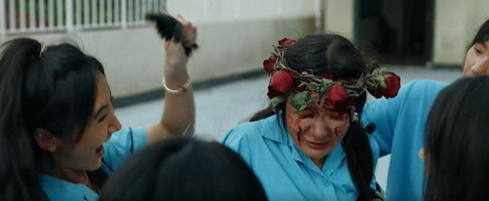 一方面,影片用了大段情节来突出校园霸凌,包括但不限于往人身上泼胶水、拿棍子戳嘴巴、给人戴带刺的花环、给人剪头发喝 " 发菜汤 "……