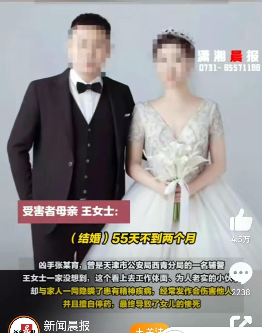 杀人凶手叫张某育,他是天津西青分局的一名辅警,在他和第一任女友准备结婚时,他被检查出来了患有精神疾病,发作时会伤害他人。