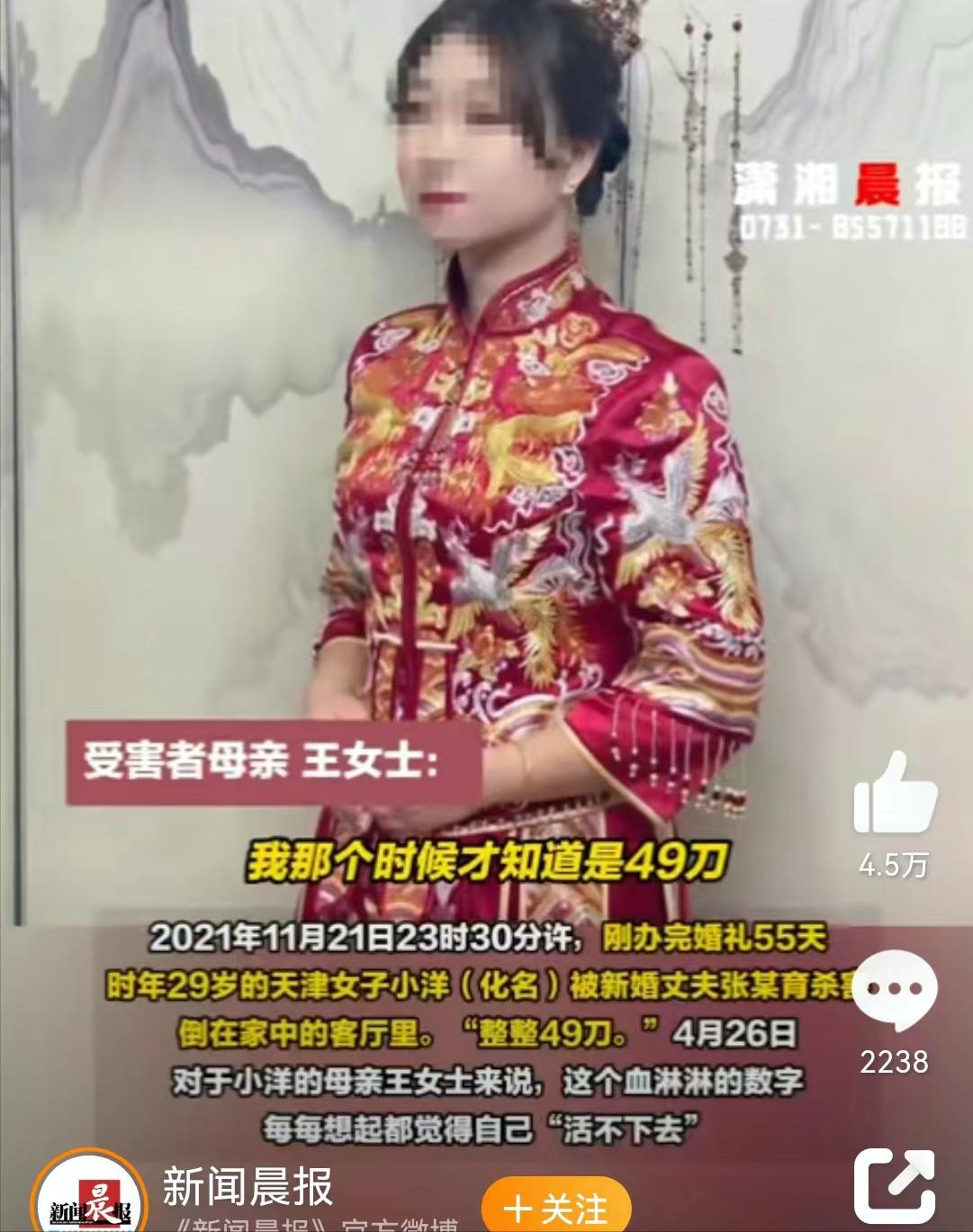 2024年4月27日报道,天津一男子将自己新婚55天的妻子杀死了,被杀女子身上整整被捅了49刀,其中10多刀都是致命伤。