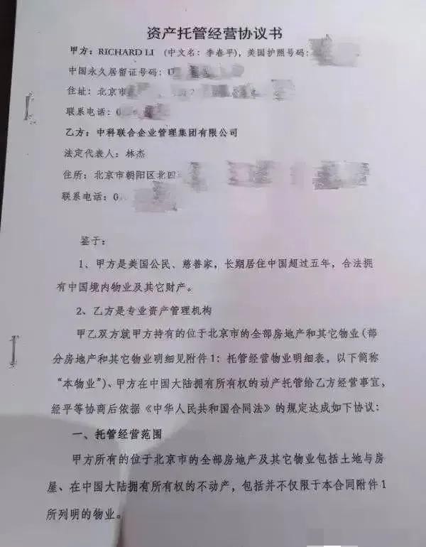 2016年,李春平的保镖刘长志将他的固定资产,托管给中科联合企业。