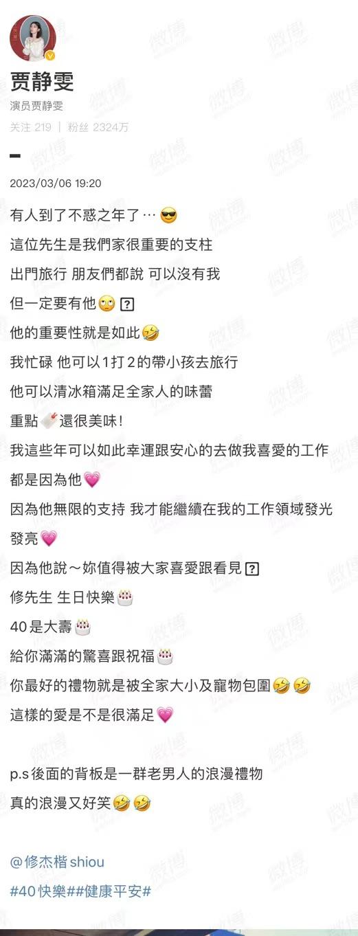 贾静雯老公(贾静雯发文庆祝老公40岁生日)