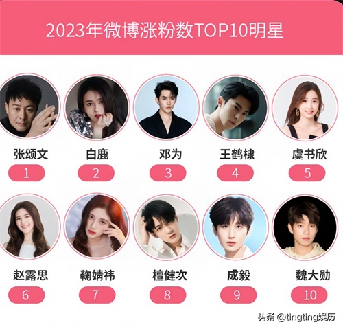2023微博涨粉数前十名明星数据来了,好六团的王鹤棣和檀健次都榜上有名,来看看你喜欢的明星上榜了吗?