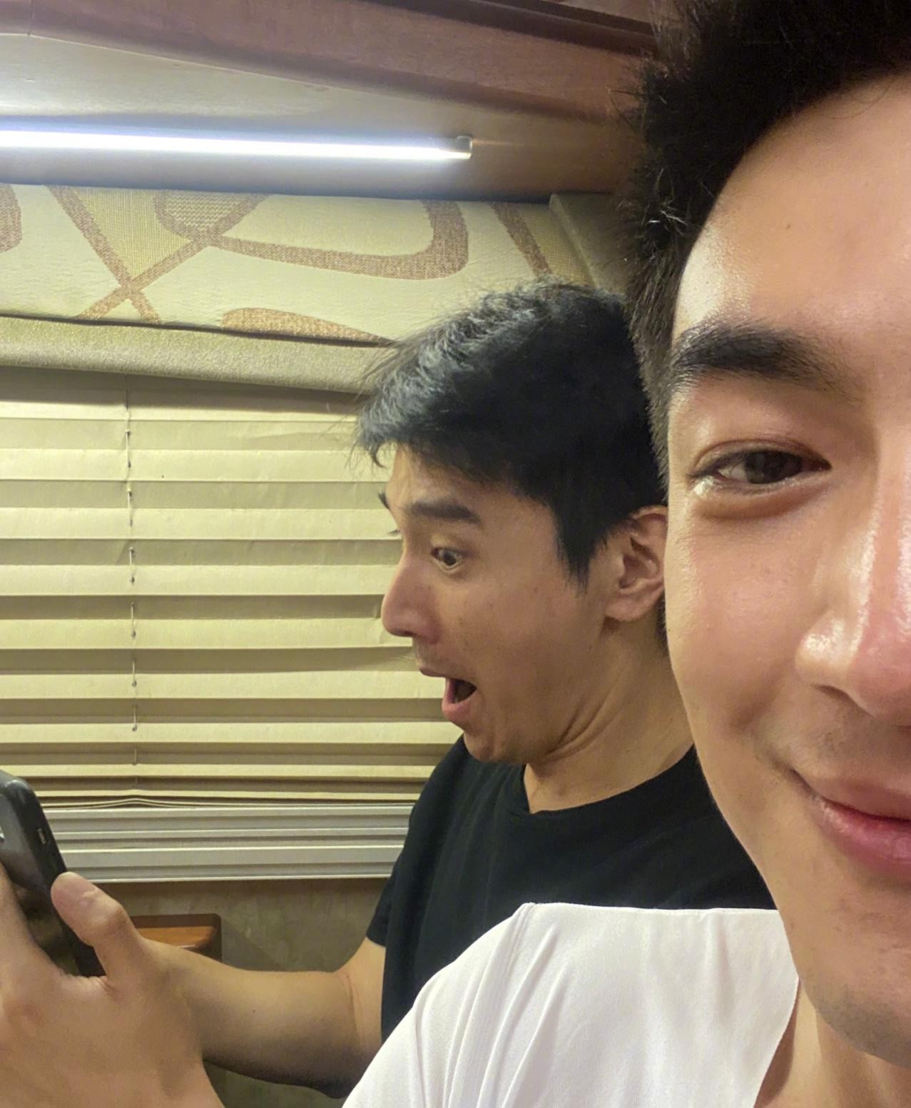 另一张照片中,赵又廷还拿起正在视频的手机屏幕给林更新看,脸上的表情非常嘚瑟,林更新则看都不看,紧紧地盯着自己的手机镜头自拍。