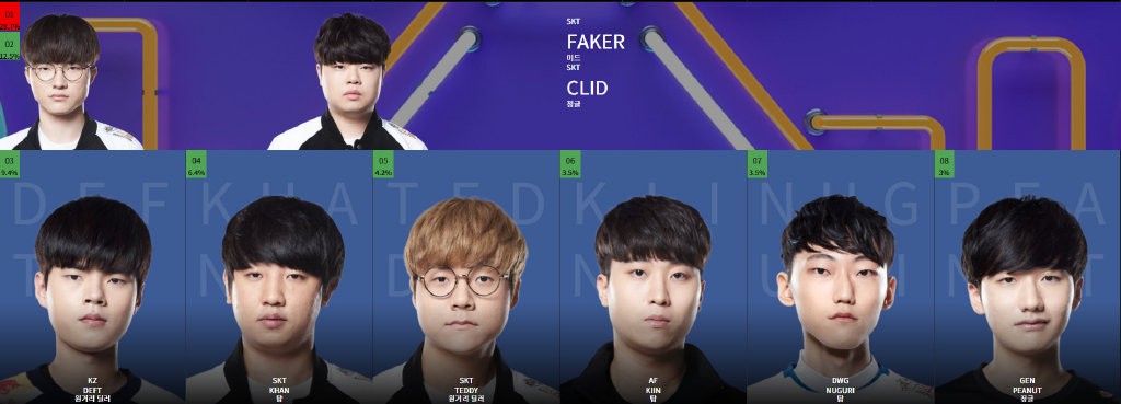 第二名的得票率为12.5%,这名选手是同为SKT的Clid,这个就有些令人意外了,虽然Clid可以说是SKT的大腿,但他S8时还在LPL中为JDG征战,经过S9的短短一年就积累了这么恐怖的人气,这点还是比较令人意外的。当然,以他在SKT中表现上看,他的确配得上这个人气!