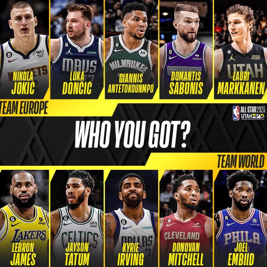 西部: 詹姆斯、东契奇、库里、约基奇、蔡恩;东部: 字母哥、杜兰特、欧文、米切尔、塔图姆(不过蔡恩因伤不大,杜兰特不确定是否出站,欧文现在在西部!)