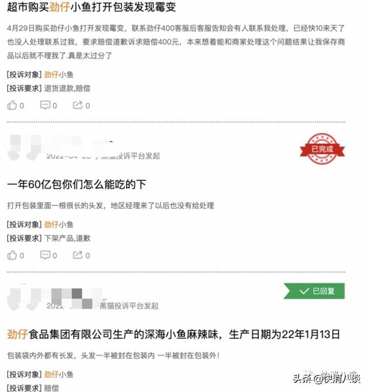 但劲仔小鱼产品频被爆食品安全问题。在黑猫投诉平台上,劲仔食品相关投诉量达900多条,有消费者表示在劲仔小鱼产品中发现毛发、异物、发霉等问题。有用户投诉称“买的两盒劲仔小鱼中发现异物后,商家退了一盒的钱,但这与食品安全法规定不符”“头发一半封在包装袋内,一半在外面”……