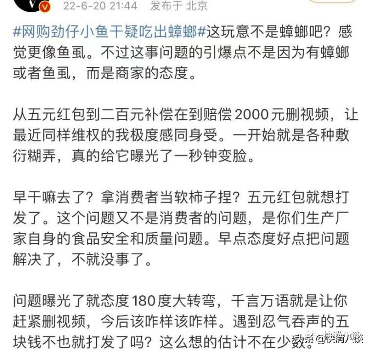 小伙为女友网购劲仔小鱼干,却吃出疑似蟑螂的虫子?客服:已要求消费者删除视频并赔偿2000元