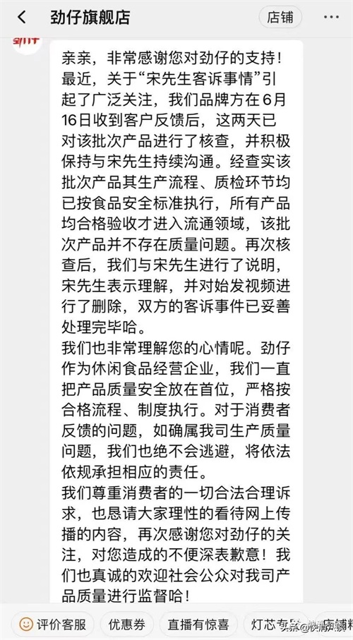 劲仔作为休闲食品经营企业,我们一直把产品质量安全放在首位,严格按合格流程、制度执行。对于消费者反馈的问题,如确属我司生产质量问题,我们也绝不会逃避,将依法依规承担相应的责任。我们尊重消费者的一切合法合理诉求,也恳请大家理性的看待网上传播的内容。食品安全是红线,也是底线。我们真诚欢迎广大消费者的监督,并诚恳接受来自各方的批评和建议。