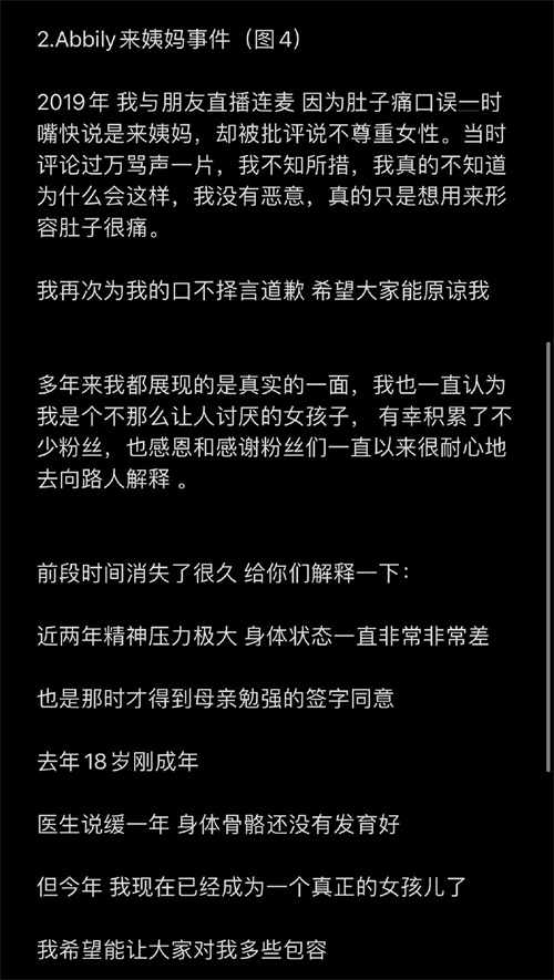 大部分的网友,应该都是通过短视频,才认识艾比这个人,在2019年艾比是一名主播,那时候跟轩墨宝宝的一次连麦中,口误结果被网友唾弃。事情经过是这样的,艾比在直播途中身体不适闹肚子,原本没什么问题,可能艾比想做节目效果,就把肚子疼说成“来姨妈”。网友清楚艾比是男孩儿,又怎么会有月经呢?此举动就是不尊重女性,因此视频的评论区里骂声一片,原本艾比没有恶意,只想形容自己肚子很痛。