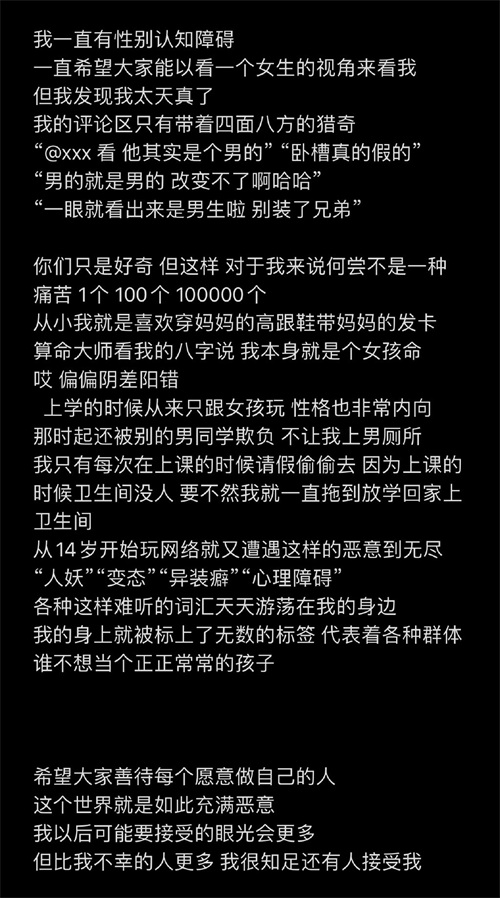 过去艾比饱受评论辱骂,也没有公开自己的真实性别,因为艾比的身份证上是男性,所以艾比并没有底气回应黑粉。面对网络上的“言语攻击”,艾比这两年精神压力很大,身体状态也非常差,勉强得到母亲的签字同意(做变性手术),去年艾比才刚刚18岁成年,身体骨骼还没有发育好。今年19岁了,艾比终于已经成为一个女孩儿,后续辟谣并未真正完全变性,但是一切已经准备好,等待时间去验证吧。