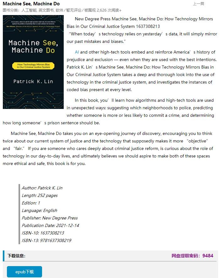 它的每本书籍都专门提供了下载方式,查看书籍简介的下方就可以看到epub格式下载,点击下载后输入验证码即可获取整本书籍。