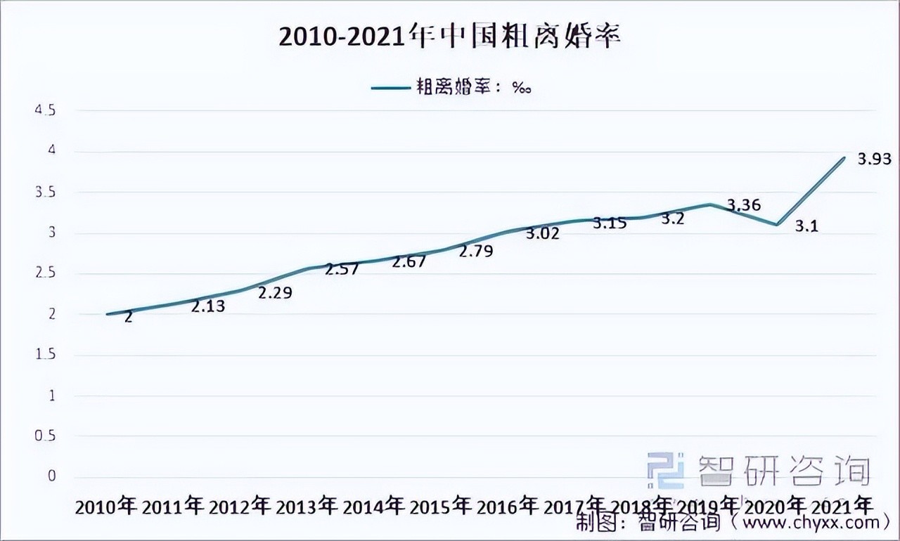 从图中可以看出,2021年全国离婚率再创历史新高,冷静期的设立,丝毫没有影响群众的离婚热情。这个离婚率是按世界上通用的做法算的,离婚率=当年结婚数/当年平均总数*1000‰。这个数字看起来比较小,但是我国人口基数大,所以离婚数是非常庞大的。