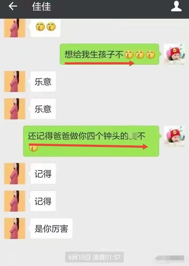 男方甚至还说出下次“让心肝宝贝晕厥”的话,而女方则非常配合的说“乐意”,满屏亲吻的表情。