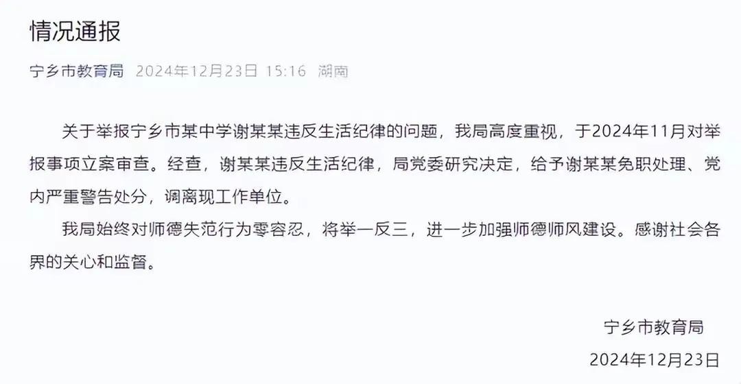 12月23日,宁乡市教育局发出了通报,对于贺某举报的谢某某违反生活纪律问题非常重视,在11月已经立案审查。经查实谢某某确实违反生活纪律,已经免职处理、严重警告处分,并调离现在的工作单位。