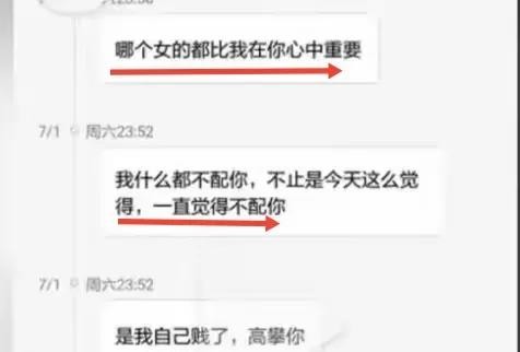 谢校长时不时的给贺某发自己的美照来宣示自己的存在,有时候还会以退为进,放低姿态来迎合贺某,说任何女人都比自己在他心中重要,是自己犯贱高攀他了,配不上他!