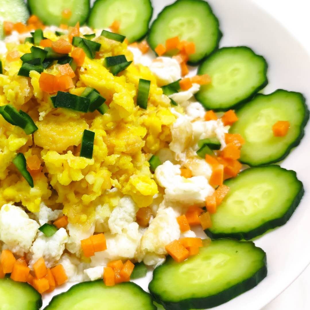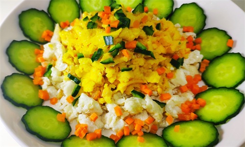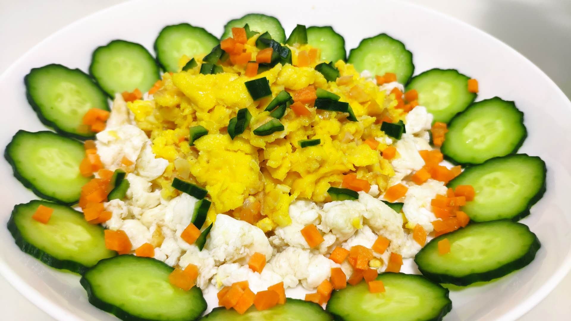 七、把炒好的蛋黄铺在炒好的蛋清上面,顿时鲜香扑鼻啊!趁味道还没飘太远,赶紧切点黄瓜片,胡萝卜末摆摆盘。拍张照片,发个朋友圈,个个讨教技巧呢。