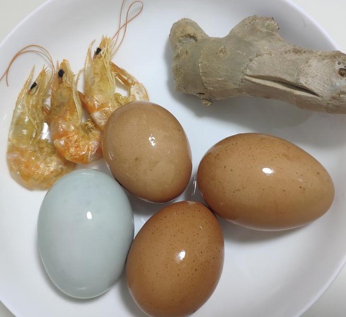鸡蛋3个,咸鸭蛋一个,虾或虾皮若干