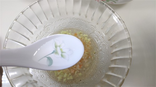 四、两个碗中各加入一半调好的的虾末姜醋汁,朝一个方向快速搅拌均匀