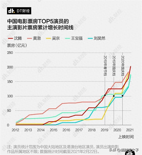 接下来,我们来探讨哪些电影帮助这五位演员达到了百亿票房。沈腾的作品中,排名前五的电影票房都在20亿以上,使他成为全中国票房最高的男演员。黄渤的票房中有献礼片如《我和我的祖国》和《我和我的家乡》,这些影片贡献了他总票房的三分之一。吴京凭借《战狼2》和《流浪地球》在票房上取得了巨大成功。王宝强和刘昊然则多亏了《唐人街探案》系列。此外,档期对票房也有着重要影响。2019年的春节档,沈腾、黄渤和王宝强齐刷刷地突破了百亿票房,当年的春节档非常火爆。国庆档也是重要的票房季,吴京和刘昊然分别在不同年份通过国庆档的影片进入百亿俱乐部。