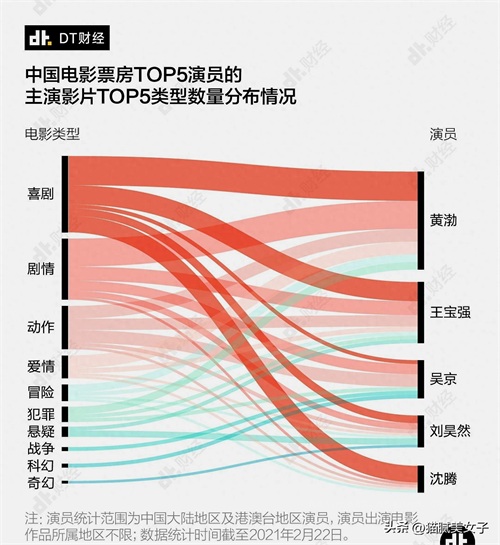 响。然而,值得注意的是,演员们的成功路径各有不同。沈腾以喜剧作品为主导,成为了标准的“喜剧人”,他的表现一直备受观众欢迎。黄渤则更为多元化,不仅主演了喜剧片,还涉足了严肃剧情、爱情和犯罪冒险等多个类型。吴京以动作片为主打,是百亿俱乐部中的独特存在。王宝强主演的作品以喜剧为主,但也涵盖了动作和爱情等类型。刘昊然作为最年轻的成员,主演作品类型相对均衡,他的戏路尚未完全定型。