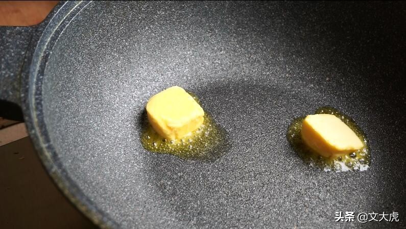 2、锅里放入40克黄油,用小火炒至黄油慢慢融化。