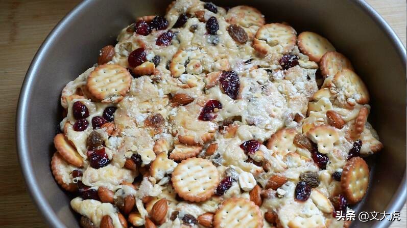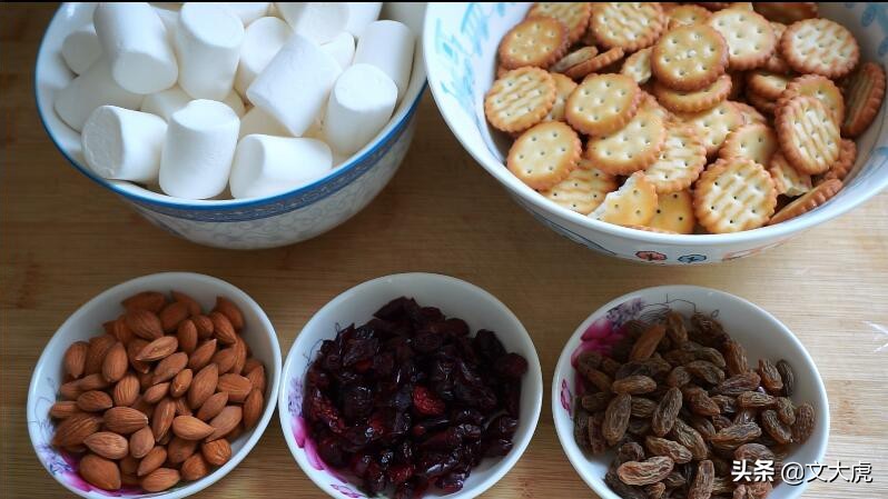 小饼干150克、杏仁40克、葡萄干40克、蔓越莓干40克、棉花糖150克、奶粉40克、黄油40克